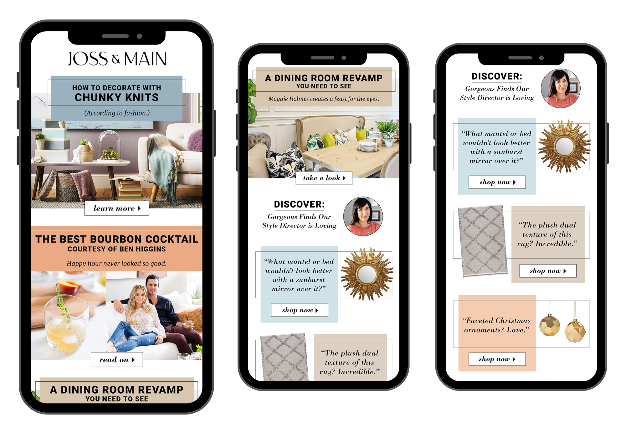 At Joss & Main, I collaborated with Editorial and Copy teams to remedy promotional email fatigue with a value-driven "trend and style" strategy that better aligned with Joss’ brand persona.