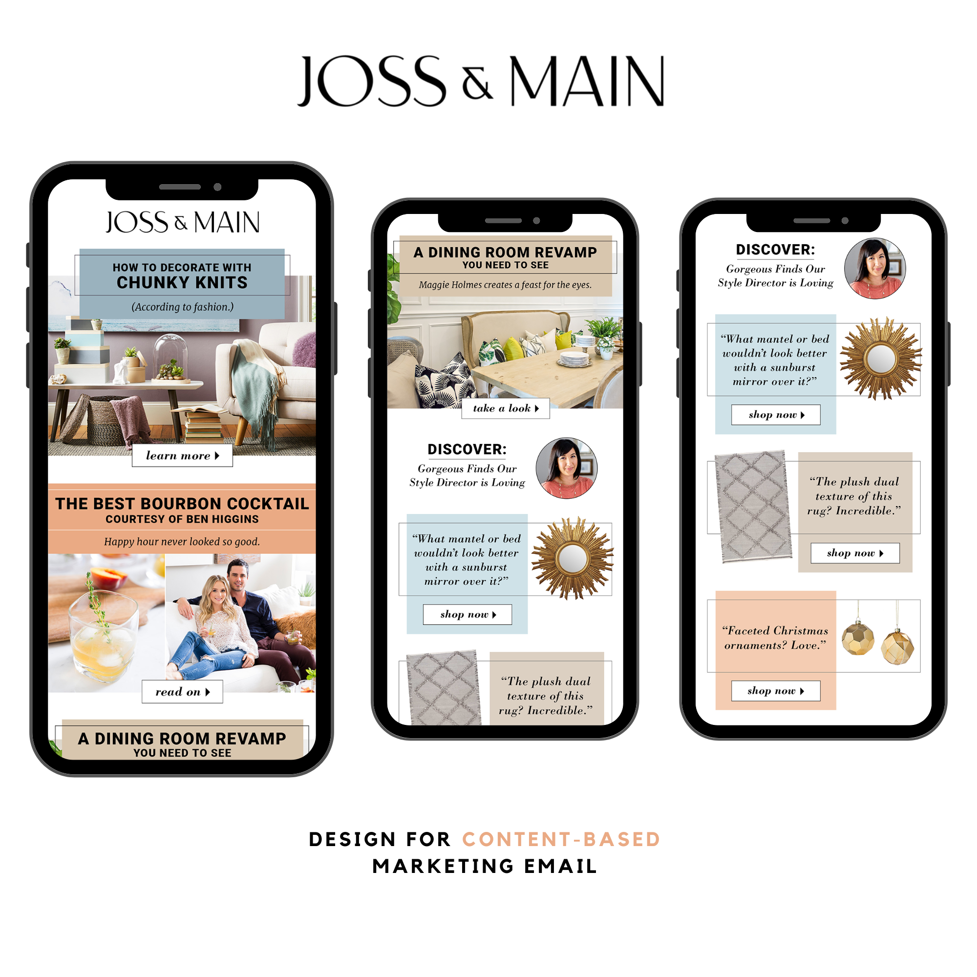 To combat promotional fatigue at Joss & Main, I spearheaded a shift from price-driven email campaigns to a value-added "trend and style advice" strategy. Leading the Production team, we conducted A/B testing to identify scalable, modular content and design systems that aligned with the brand’s persona as a "stylish friend" rather than a discount retailer.